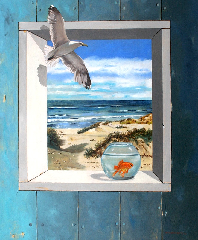 In het vierkante kader van een verweerd venster ontvouwt zich de oneindigheid van lucht en zee, waar een meeuw de vrijheid kiest en een goudvis droomt van water zonder glas.