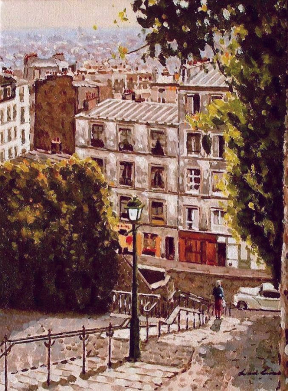 Beroemde trappen bij het Montmartre in Parijs. Leo van den Ende heeft een aantal jaren in Frankijk gewoond en schildert ook graag tafereeltjes uit die tijd.