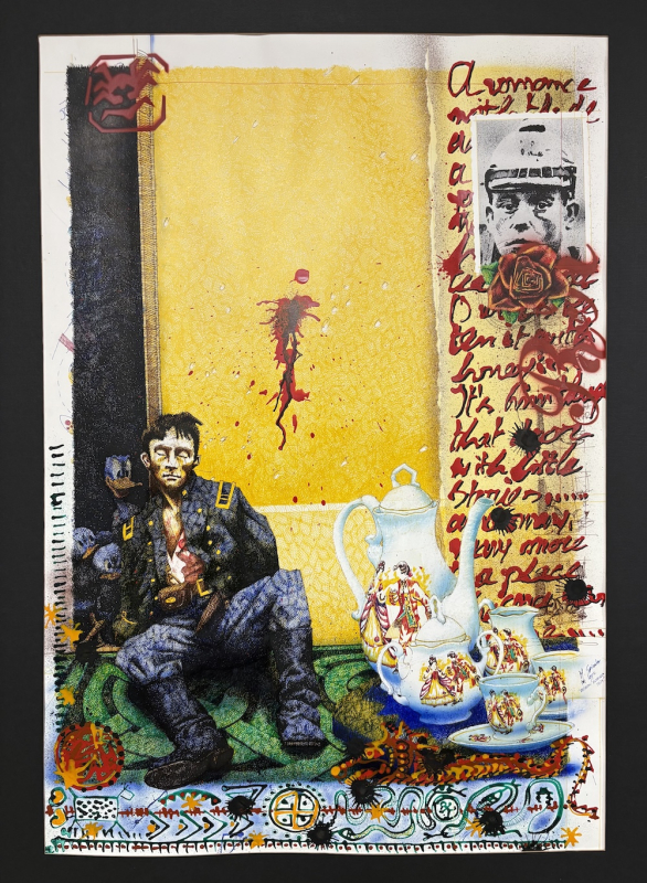 Naast het servies loopt een kolom met roodgeschreven zinnen, half leesbaar, half overschilderd. Daartussen duikt een oude zwart-witfoto op van een man met helm. Een roos is ertegenaan gezet, als een haastig aangebracht eerbetoon of misschien juist als een ironische noot. Over de randen heen krioelen patronen, tekens, vlekken in inkt: als restanten van gedachten die nergens anders heen konden.