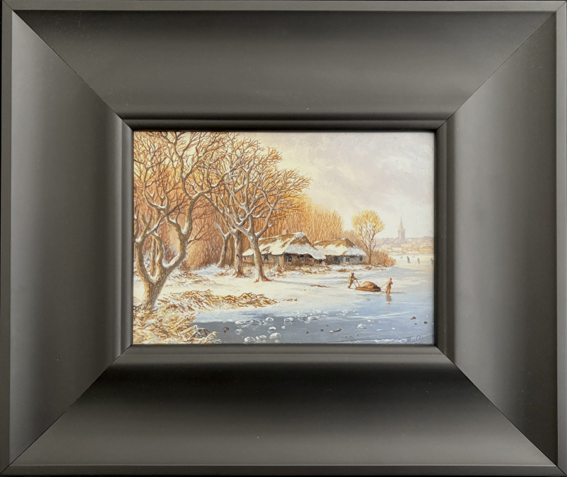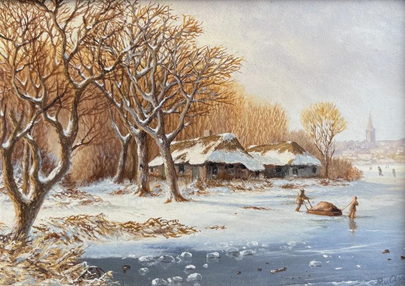 Op het bevroren water trekken twee mannen een slee vol goederen voort, stap voor stap richting het dorp dat in de verte zichtbaar is. Een paar schaatsers glijden voorbij, klein tegen de bleke lucht en de toren die boven de huizen uitsteekt.