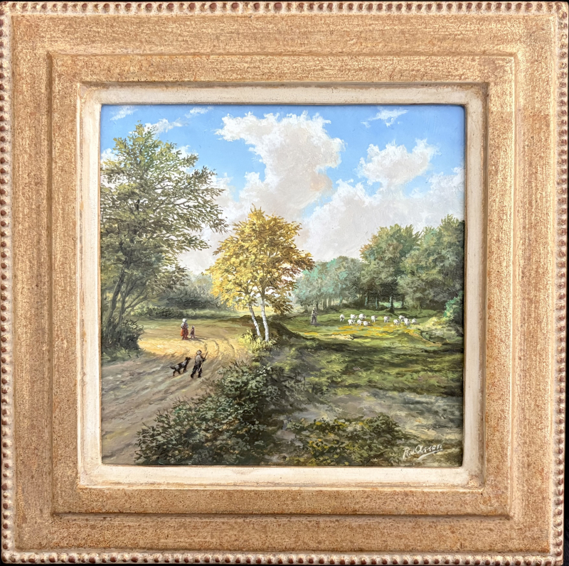 Op een zandpad dat slingert tussen het groen lopen twee wandelaars met hun hond de zon tegemoet. Het licht valt warm over het pad en speelt met de schaduwen van de bomen. Even verderop, half verscholen in het veld, waakt een herder over zijn kudde schapen die rustig grazen in het frisse gras.
