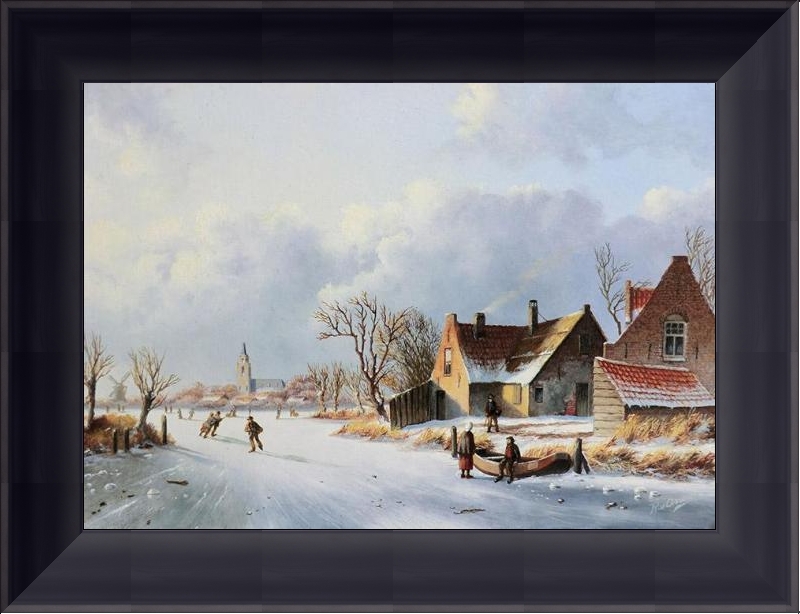 Schilderij van een winterlandschap met schaatsende figuren op de achtergrond. De bewoners van de huisjes langs de bevroren rivier maken een praatje met elkaar genietend van de winterzon.